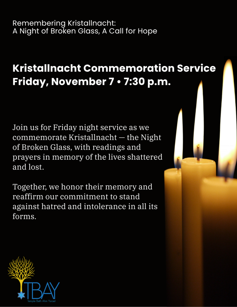 Join us for Friday night service as we commemorate Kristallnacht — the Night of Broken Glass, with readings and prayers in memory of the lives shattered and lost.