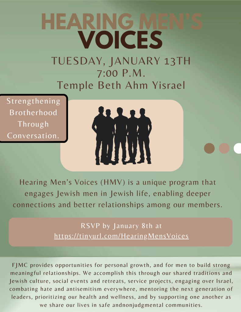Hearing Men’s Voices (HMV) is a unique program that engages Jewish men in Jewish life, enabling deeper connections and better relationships among our members.