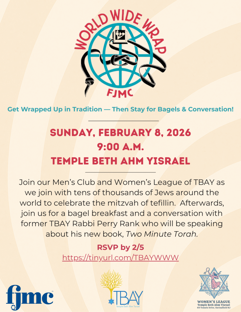 Join our Men’s Club and Women’s League of TBAY as we join with tens of thousands of Jews around the world to celebrate the mitzvah of tefillin. Afterwards, join us for a bagel breakfast and a conversation with former TBAY Rabbi Perry Rank who will be speaking about his new book, Two Minute Torah.