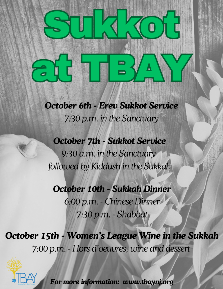 October 7 – Sukkot Service 9:30 a.m. in the Sanctuary followed by Kiddush in the Sukkah